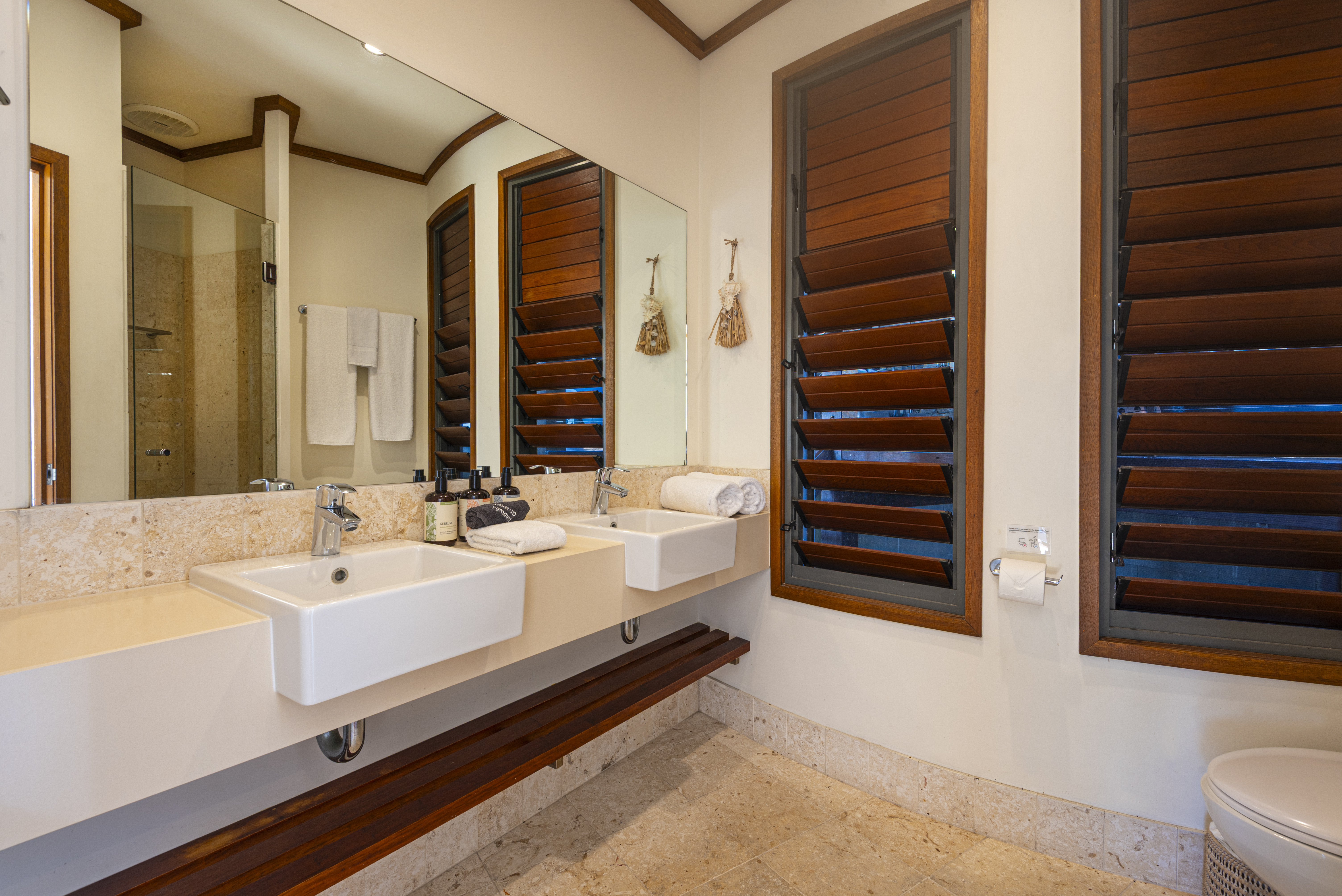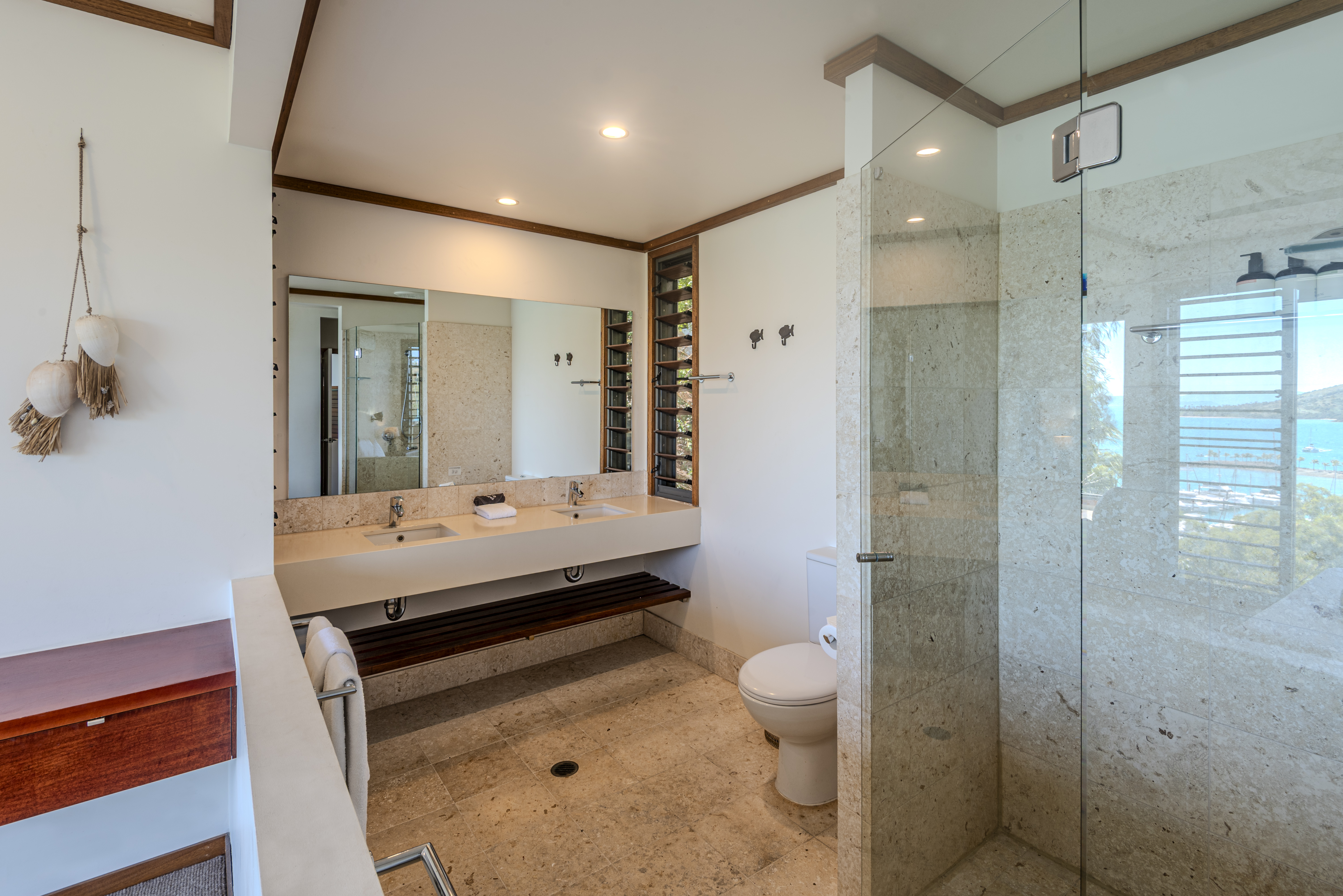 Whether you're travelling with family or friends, there's ample space and thoughtful design to make your stay truly exceptional. Spread across two vast levels, the home features five bedrooms and four bathrooms, ensuring plenty of room for everyone to relax. The main suite, with its private daybed and sweeping marina views, offers a serene escape. Downstairs, a self-contained guesthouse with its own ensuite, kitchenette, and living area provides additional privacy, making it perfect for multi-family stays or groups seeking separate spaces. Please note, you must exit outside on the downstairs balcony to enter the guesthouse.