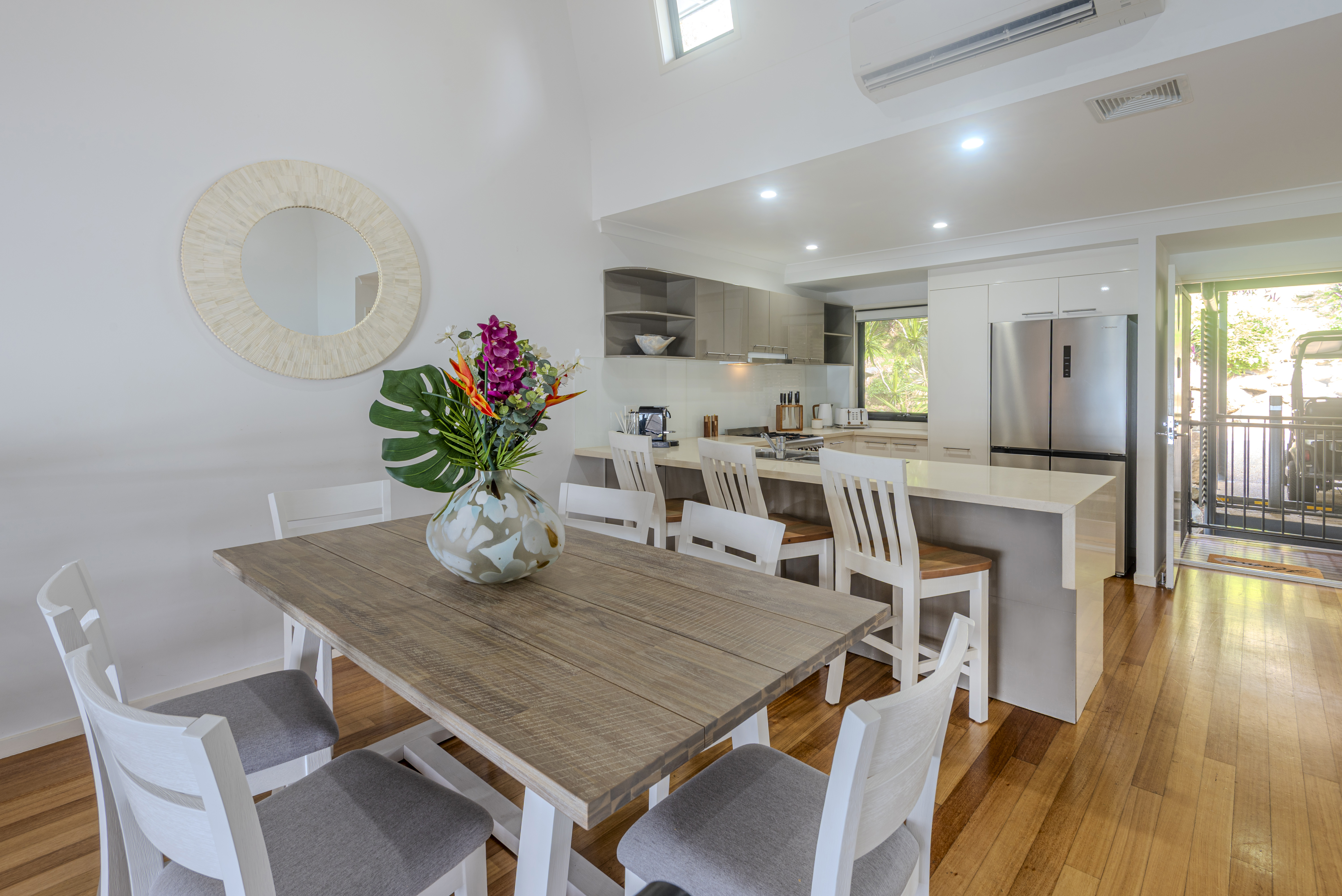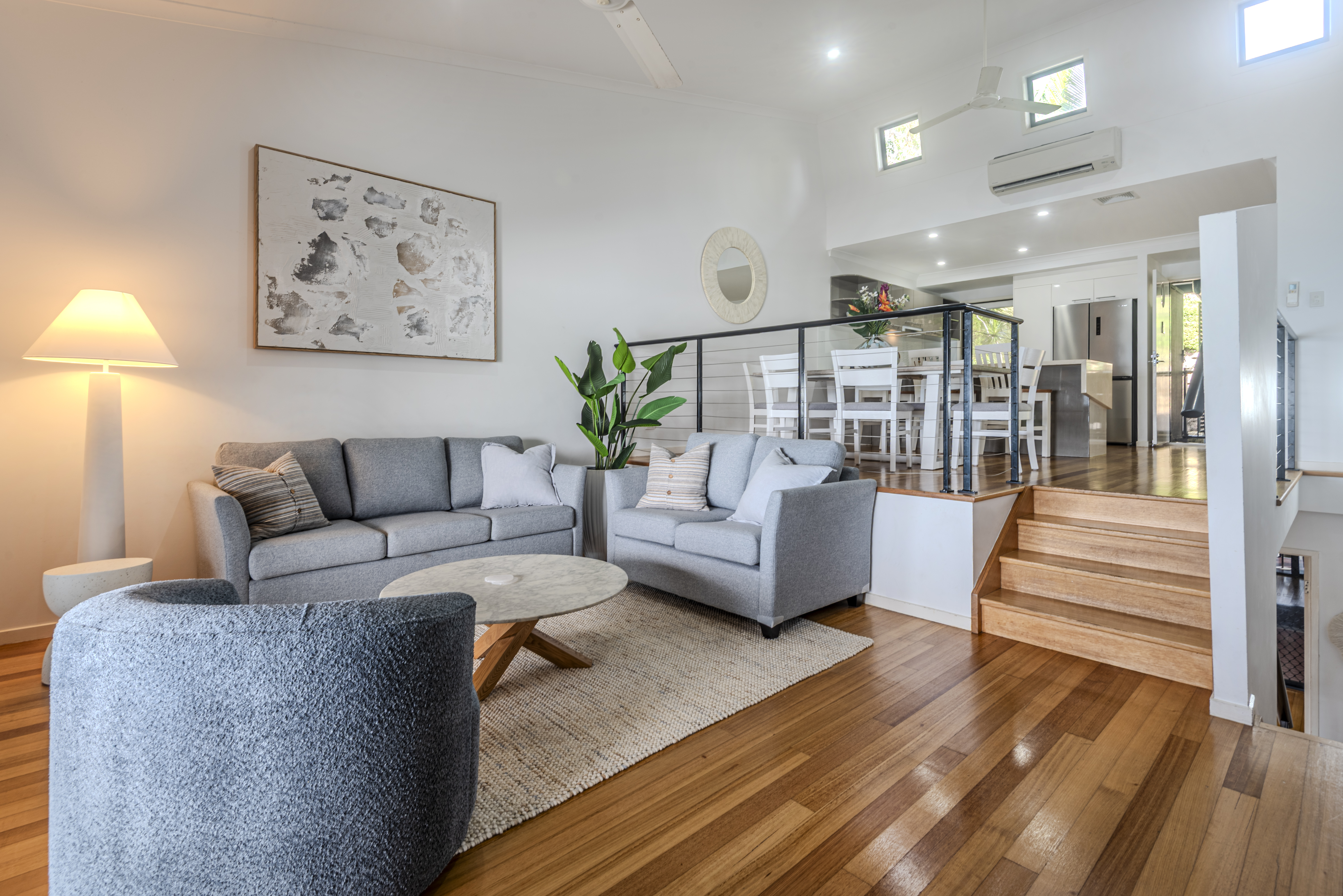 This beautifully furnished two-story apartment combines spacious elegance with thoughtful design. On the entrance level, the open-plan kitchen and dining area seamlessly flow creating plenty of light and space. A few steps down lead you to the lounge room and large balcony, perfect for enjoying stunning sunsets with outdoor dining and a BBQ.