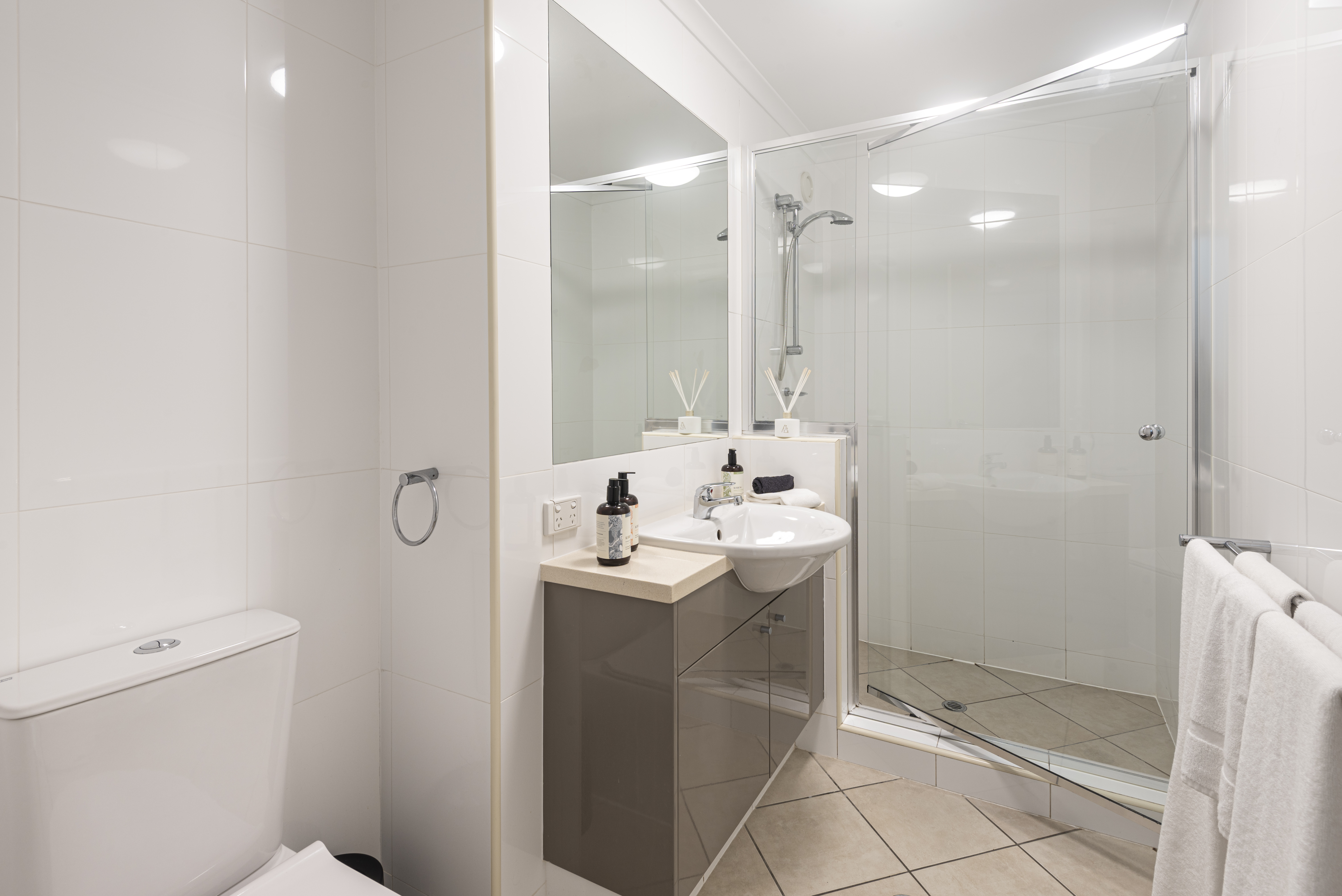 The lower floor hosts two generously sized bedrooms. The main suite features a king bed, a spacious ensuite, and its own private balcony, while the second bedroom, with a queen bed, is conveniently located next to another bathroom. The apartment’s split-level layout is ideal for couples or small families.